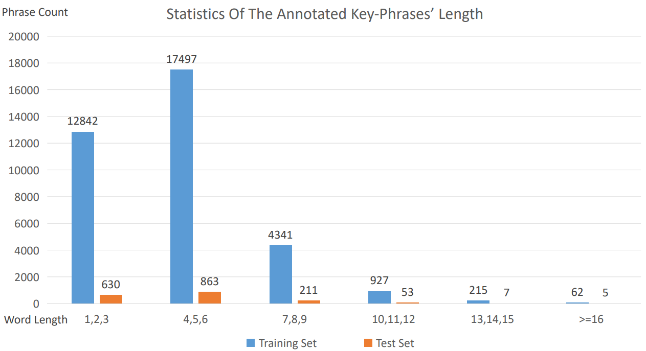The training set we split contains annotated more than 35,884 Fin-tech domain key-phrases which contains 11,434 different key-phrases after removing duplicated phrases, and the test set contains more than 1769 Fin-tech key-phrases which contains 1,439 different key-phrases after removing duplicated phrases.